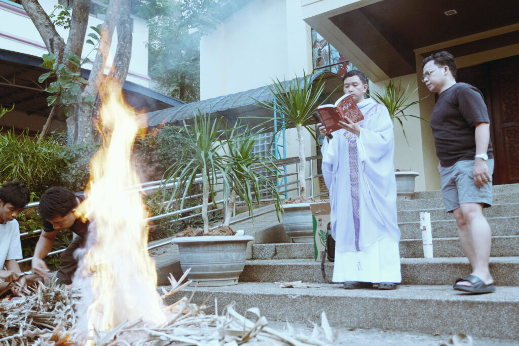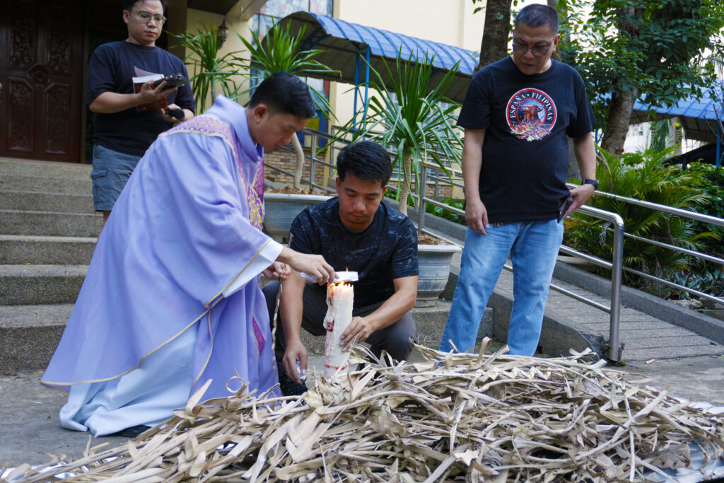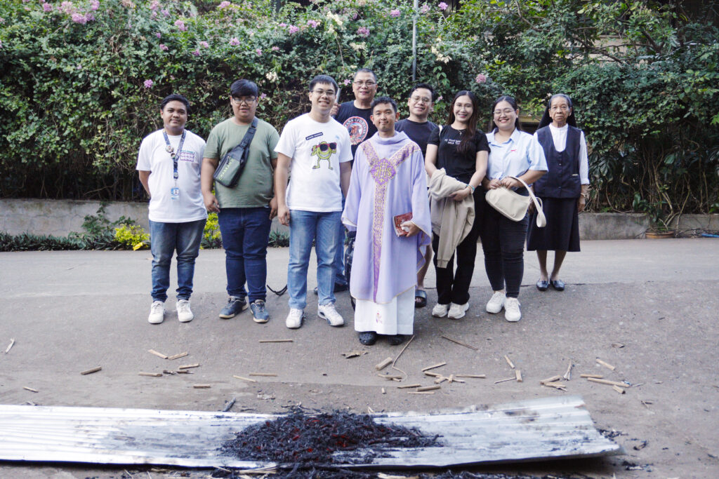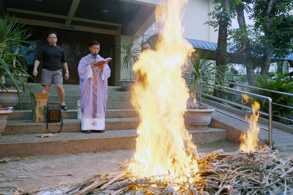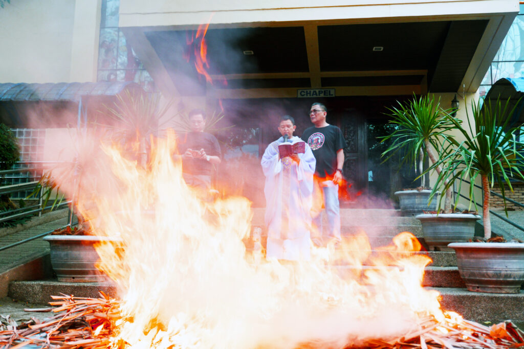 SANTIAGO CITY – University of La Salette conducted a short prayer service in front of the Junior High School Chapel and burned the withered palm branches from last year’s Palm Sunday that will be used for tomorrow’s Ash Wednesday, February 17.